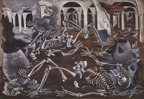 En Cloacas y campanarios (1929-1932) abandona el color para mostrar en un especie de «grisallas» una visión apocalíptica con paisajes abandonados, ásperos y secos, como en el óleo Antro de fósiles (imagen de abajo). Es su obra más cercana al surrealismo (en 1932 viajó a París y conoció a André Breton).