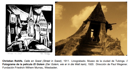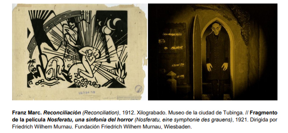 Remarcar la expresión de los actores con gestos y maquillajes tétricos, escenografías oblicuas, sombras alargadas, contrastes lumínicos extremos y tramas donde el delirio, el crimen y la paranoia se mezclaban con lo fantástico y lo monstruoso, definieron el cine expresionista alemán para reflejar la incertidumbre de la República de Weimar, en donde palpitaba la sensación de que la realidad podía descomponerse en cualquier momento. Al igual que la pintura que mostró lo morboso y sirvió de crítica y espasmo, con técnicas como la xilografía, con la que los artistas podían plasmar su concepción de arte inacabado y convulso, cercano al primitivismo.